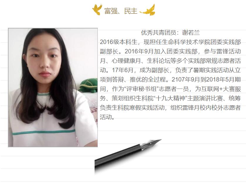 为隆重纪念五四青年节,树立和宣讲先进典型,激励广大团员、学生勤奋学习、积极工作,院团委将在五四青年节之际展示一批优秀学生干部、优秀共青团干部和优秀共青团员的事迹。本篇内容是关于优秀共青团员的事迹展示。