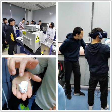 在大学生创新创业实验室,李军老师十分热情的邀请同学们体验实验室学生团队研发出来的VR产品,现场体验了VR手术协作平台系统;在动物房,同学们与实验室所用的小鼠进行了亲密互动;在多功能分子探针及分子生物和精密仪器实验室,大家了解了相关实验器材如离心机、冻干机、磁力搅拌器、紫外分光光度计等实验设备的应用场景;