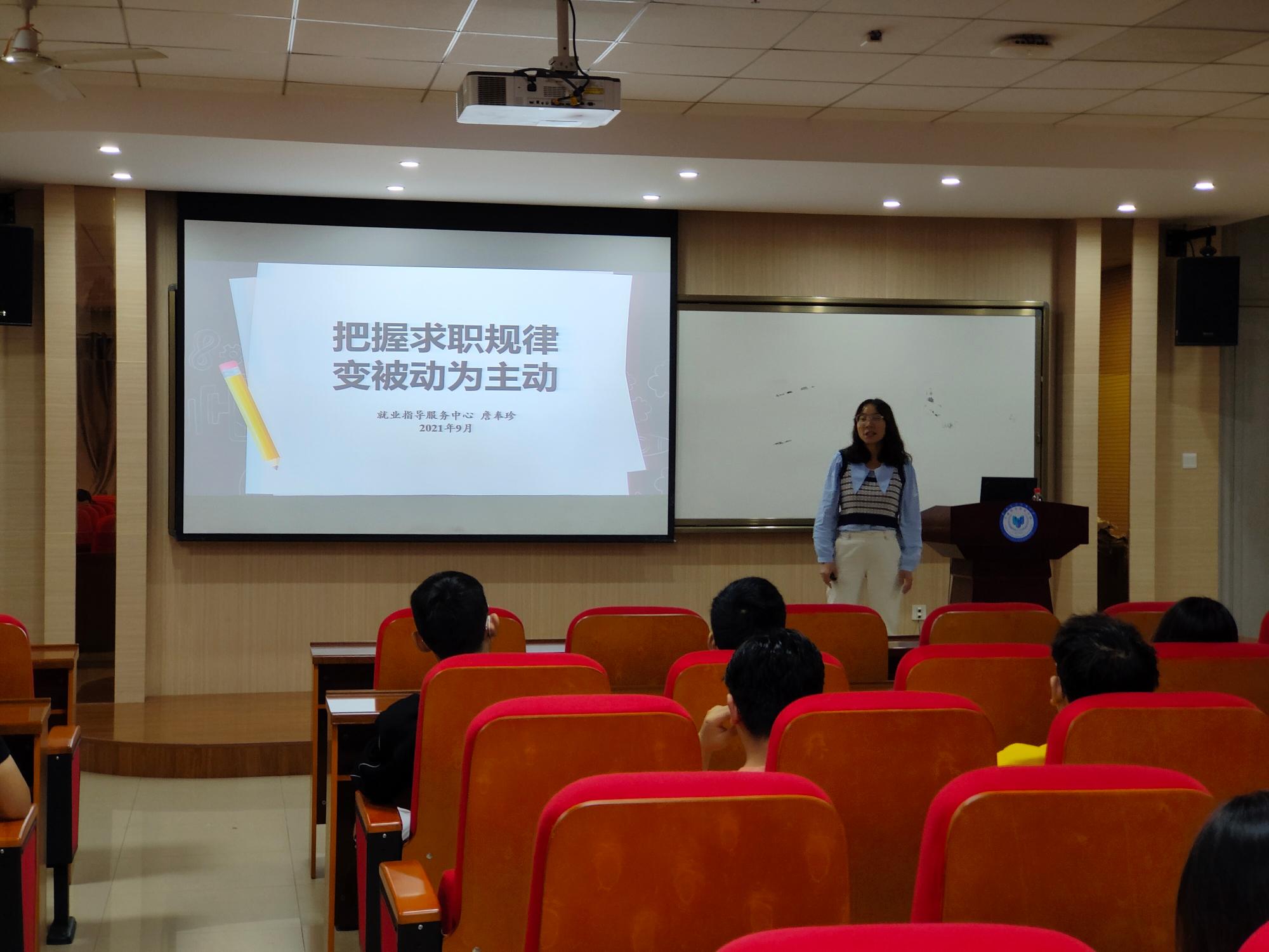 自党史学习教育开展以来,太阳集团官网坚持把“我为群众办实事”作为党史学习教育的出发点和落脚点,本着“把好事办实、把实事办好、办到师生心坎上”的原则, 2021年9月24日下午,太阳集团官网举办了“把握求职规律,变被动为主动”的求职攻略讲座,着力营造有利于学生就业的良好氛围,同时帮助学生全面了解当前全球新一轮科技革命和产业变革背景下,就业形势的多样化以及复杂化,助力学生高质量就业。此次讲座由学校本科生院研究生就业办公室主任詹奉珍老师主讲,学院党委副书记崔传贞、辅导员郭瑞、2018级本科生和2019级研究生参加了此次会议。