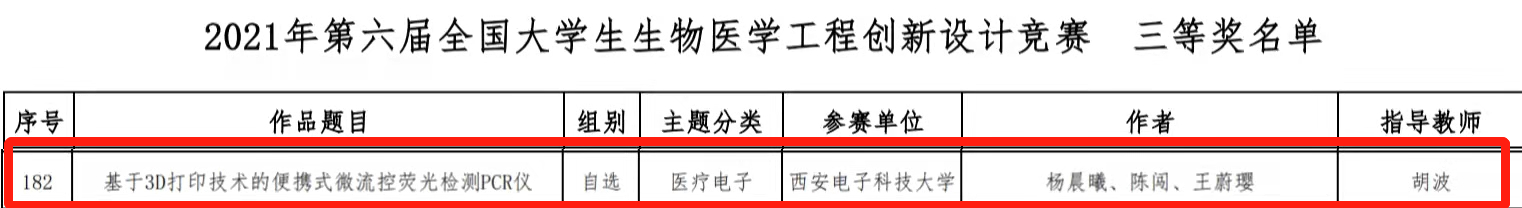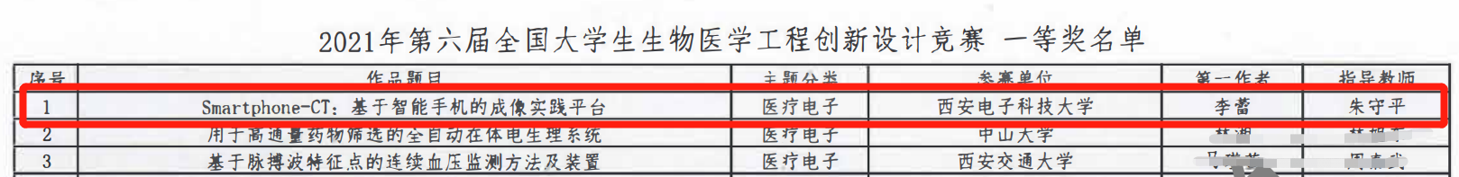 近日,2021年第六届全国大学生生物医学工程创新设计竞赛决赛在中山大学以线上方式顺利举行。经过预赛和决赛的激烈角逐,生科院参赛作品《Smartphone-CT: 基于智能手机的成像实践平台》(指导教师:朱守平,参赛学生:李蕾、栗军涛)获全国一等奖;《高通量细胞分析仪》(指导教师:陈雪利,参赛学生:王朝晖、孙瑞璟、周秋园)获全国二等奖;《基于3D打印技术的便携式微流控荧光检测PCR仪》(指导教师:胡波,参赛学生:杨晨曦、陈闯、王蔚璎)获全国三等奖。