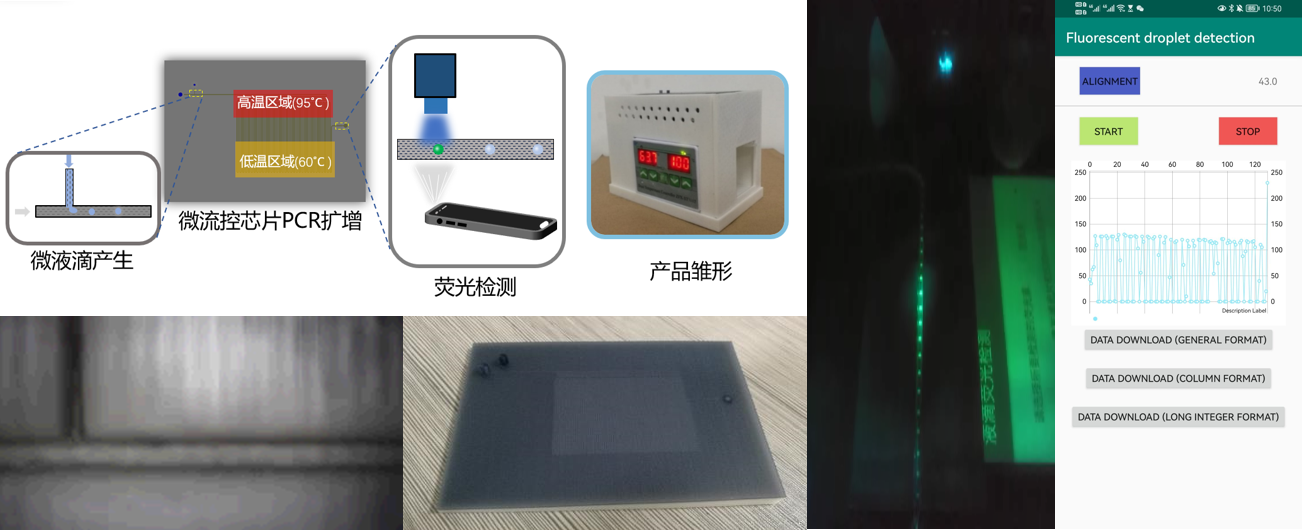 该作品采用3D打印技术制备微流控芯片,以降低芯片制备难度;使用流动液滴作为反应单元,并配合良好的液滴发生装置,以保证每个反应单元的数据稳定性;通过液滴流过不同的温度区域,以省去传统PCR仪反复升温降温过程。同时,结合基于智能手机的荧光检测模块,于反应终点进行产物检测,得到扩增结论和产物检测数据。作品便携度高、成本低廉,可以实现精确的PCR扩增与检测,在灾区检疫、疫情应急、法医、科研等领域有广泛应用。
