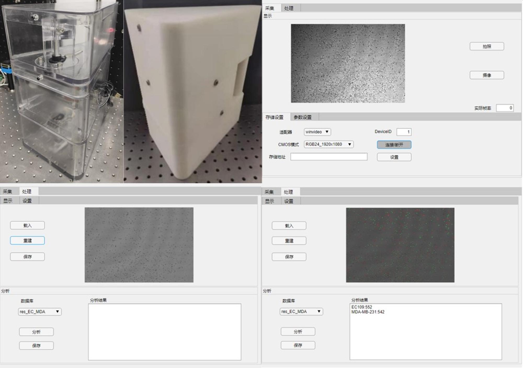 该作品基于无透镜计算显微成像原理,利用物光和参考光干涉,由探测器记录样本的波前信息,再用开发的图像重建算法对采集图像进行重建,得到细胞的振幅或相位图像,之后通过神经网络区分出癌细胞和正常细胞。该作品能够以毫米级大视野、微米级空间分辨率进行成像,成像速度可达20fps,可实现活细胞的无标记非侵入的高通量计数与分类。作品系统结构简单,操作便携,成本低,对于提升现有细胞分析技术具有重大意义。