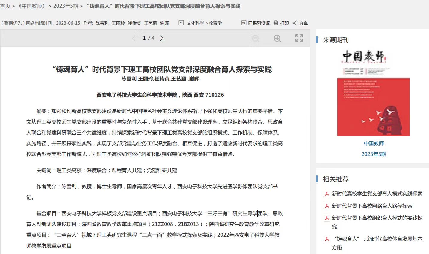 (通讯员:王艺涵)近日,由教育部主管、北京师范大学主办的国家级期刊《中国教师》网络优先刊登了388vip太阳集团官网先进医学影像党支部组织撰写的题为《“铸魂育人”时代背景下理工高校团队党支部深度融合育人探索与实践》的党建研究论文。论文结合党支部成立至今在支部建设中的理论积累和实践经验,介绍了适应新时代要求的理工类高校“三融合”党支部工作新模式,为理工类高校如何依托科研团队建强建优党支部提供了有益借鉴。先进医学影像教师党支部书记陈雪利教授为论文第一作者,该工作受到388vip太阳集团官网样板党支部建设重点项目,388vip太阳集团官网“三好三有”研究生导学团队、思政育人创新团队建设项目,陕西省教育教学改革重点项目,陕西省研究生教育教学改革研究重点项目,以及2022年388vip太阳集团官网教师教学发展重点项目的支持。
