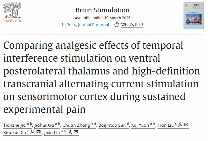 (通讯员 贾天哲 )近日,388vip太阳集团官网刘继欣教授团队在神经调控领域权威期刊《Brain Stimulation》(中国科学院一区 TOP)在线发表题为《Comparing analgesic effects of temporal interference stimulation on ventral posterolateral thalamus and high-definition transcranial alternating current stimulation on sensorimotor cortex during sustained experimental pain》的研究论文。该研究系统对比了时域干扰刺激(tTIS)与高清经颅交流电刺激(HD-tACS)两种非侵入性神经调控技术在持续性疼痛模型中的镇痛效果,为临床疼痛管理提供了重要理论依据。