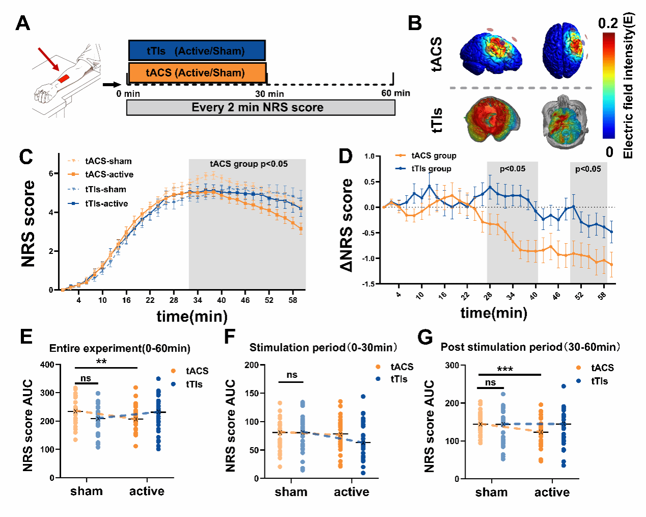 作为国际疼痛研究协会(IASP)定义的第五大生命体征,慢性疼痛严重影响全球约 20% 人群的生活质量。传统镇痛方法存在药物依赖和侵入性风险,非侵入性神经调控技术因其可逆、安全的特性成为研究热点。刘继欣教授团队聚焦于新型神经调控技术开发,针对深部脑区刺激精度不足和皮层刺激效应短暂等关键问题,创新性地采用时域干扰刺激(tTIS)与高清经颅交流电刺激(HD-tACS)开展对比研究。