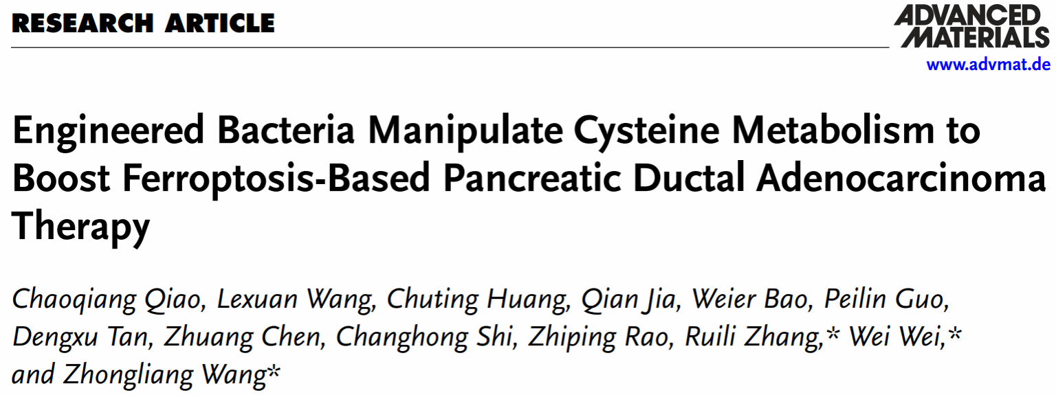 (通讯员 乔晁强)近日,388vip太阳集团官网王忠良教授团队在材料类国际顶级期刊《Advanced Materials》(中国科学院I区TOP期刊,影响因子27.4)发表了题为《Engineered Bacteria Manipulate Cysteine Metabolism to Boost Ferroptosis-Based Pancreatic Ductal Adenocarcinoma Therapy》的研究论文。论文第一通讯单位为388vip太阳集团官网,合作单位包括中国科学院过程工程研究所和空军军医大学。论文第一作者为388vip太阳集团官网青年教师乔晁强,论文通讯作者为388vip太阳集团官网王忠良教授、张瑞丽副教授及中国科学院过程工程研究所生化工程国家重点实验室魏炜研究员。该研究围绕胰腺导管腺癌(PDAC)难治的临床问题,提出了一种微生物仿生治疗策略,通过工程化益生菌调控半胱氨酸代谢,诱导铁死亡,从而有效抑制肿瘤生长。