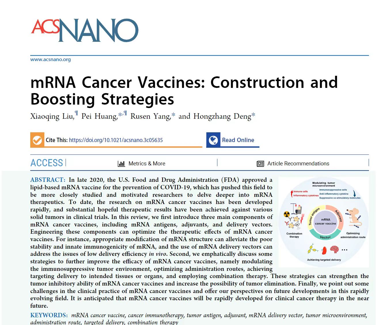 (通讯员:刘小庆)近日,388vip太阳集团官网邓宏章教授在国际知名期刊《ACS Nano》(中科院一区,IF= 17.1)发表了题目为:mRNA cancer vaccines: construction and boosting strategies的论文,概述了mRNA癌症疫苗的最新研究进展。对传统疫苗设计与机器学习辅助设计纳米疫苗等新兴策略进行了详细讨论。