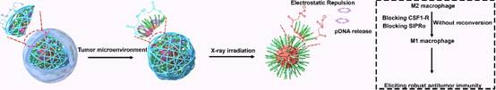 巨噬细胞是适应性免疫系统和先天免疫系统中的重要组成部分,在肿瘤发生发展过程中也发挥着重要的作用,称之为肿瘤相关巨噬细胞。肿瘤相关巨噬细胞在肿瘤整体中占比约为50%以上,是肿瘤中重要的一类免疫细胞。肿瘤相关巨噬细胞有两种不同功能状态的表型,M1(促炎)和M2(抗炎)表型。M1巨噬细胞能够吞噬肿瘤细胞,实现抑制肿瘤生长以及复发,M2巨噬细胞则恰恰相反,其主要功能是促进肿瘤细胞生长与侵袭。在过去的多年研究中,针对两种肿瘤相关巨噬细胞截然不同功能,科研工作者们主要聚焦于采用多种策略与手段来促进M2向M1巨噬细胞复极化或直接抑制M2巨噬细胞活性。作为经典的肿瘤治疗策略,上述研究工作取得了一定的肿瘤治疗效果。然而其肿瘤长期治疗效果差以及后期易复发转移仍旧是一个棘手的问题。其中原因可能来自于极化为M1的巨噬细胞会再转化为M2表型,使得治疗效果不能持久高效。到目前为止,很少有关于巨噬细胞从M2表型重编程到M1表型而不进行再转化的研究,如何持久性保持激活的M1表型,防治恢复为M2表型是我们需要解决的主要问题。