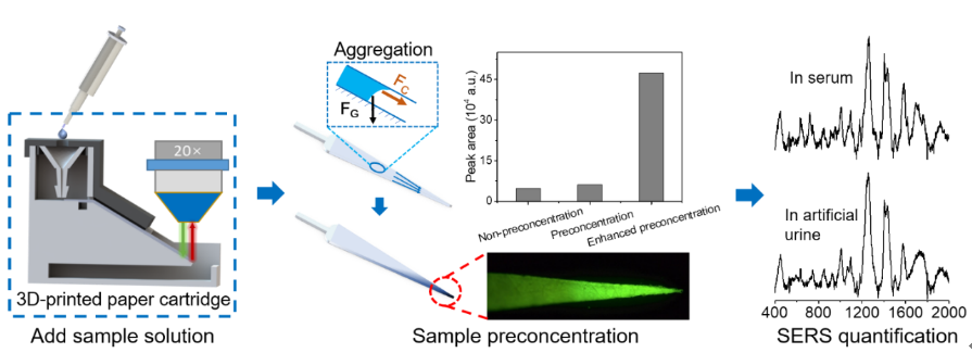 体液中药物,尤其是抗癌药物的检测对于提高药物的治疗效率、开发临床诊疗新工具意义重大。但是传统检测技术需要多步操作,存在过程复杂、耗时较长且费用较高等弊端,极大地限制了临床诊断中药物检测的发展。该团队针对以上难题,创新性地研发了一种便携式的用于体液中抗癌药物检测的试纸盒,该试纸盒包括纸尖状的表面增强拉曼散射(SERS)基底和3D打印的检测盒,通过对试纸盒的设计参数及其在体液样本中的预浓缩效果、定量检测性能进行系统研究,发现该试纸盒将预浓缩能力提高了18.13倍,与非预浓缩的方法相比,SERS性能提高了9.93倍,进而实现了牛血清或人工尿液中抗癌药物盐酸表柔比星,环磷酰胺及其混合物的快速预浓缩和直接定量检测。值得一提的是,该试纸盒采用了一体化的检测流程,检测时间从一天缩短到1小时,包括样品预处理和预浓缩,干燥,SERS测量和定量分析,但成本却较市面常见检测试剂盒降低了至少50倍,有望在临床诊断中成为一种药物预浓缩和定量的即时检测工具。