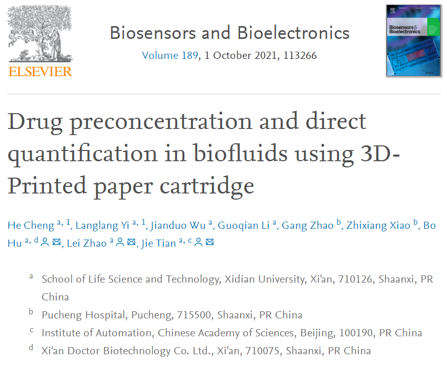 论文信息:研究生程贺和博士生宜浪浪为该论文的共同第一作者,青年教师赵磊为共同通讯作者,He Cheng,#Langlang Yi,#Jianduo Wu,Guoqian Li,Gang Zhao, Zhixiang Xiao,Bo Hu,* Lei Zhao,*Jie Tian,*Drug Preconcentration and Direct Quantification in Biofluids Using 3D-Printed Paper Cartridge, Biosensors and Bioelectronics, 2021, 189, 113266.