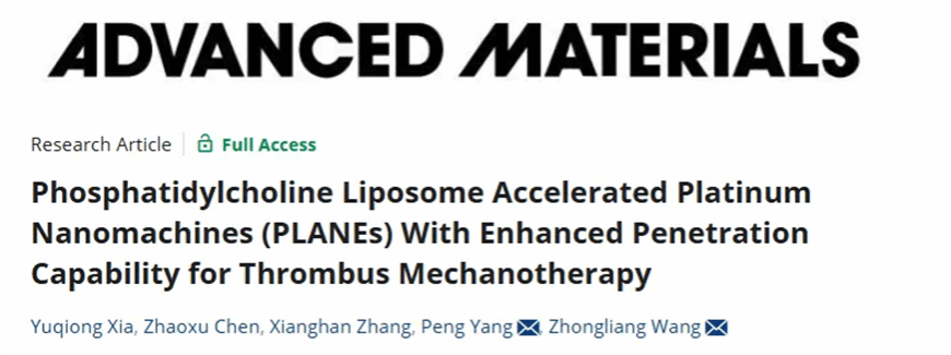 Y. Xia, Z. Chen, X. Zhang, P. Yang, Z. Wang, Phosphatidylcholine Liposome Accelerated Platinum Nanomachines (PLANEs) With Enhanced Penetration Capability for Thrombus Mechanotherapy. Adv. Mater. 2025, 2418590. https://doi.org/10.1002/adma.202418590