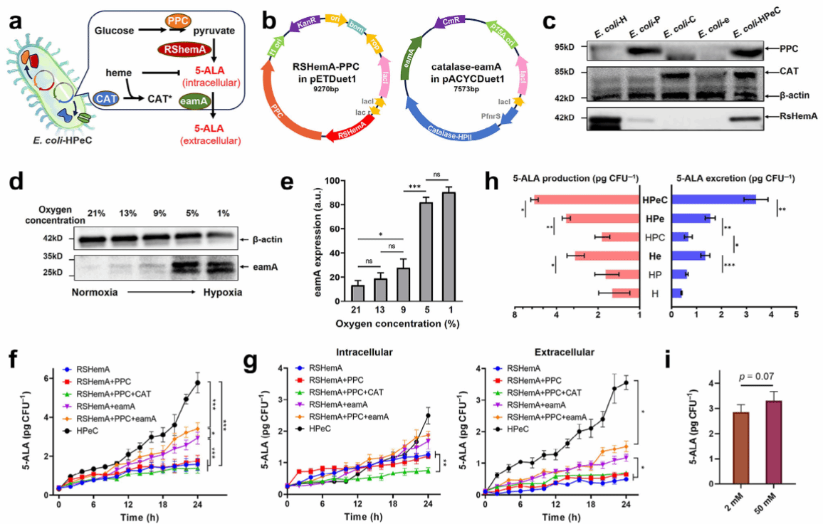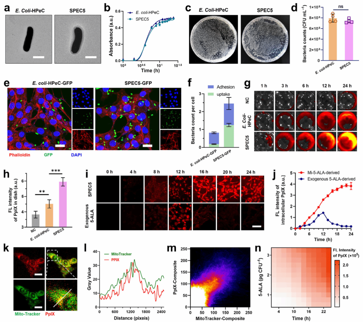 团队开发的SPEC5系统,是一种通过基因回路优化和同源肿瘤细胞膜伪装设计的工程细菌平台,实现了高效且精准的肿瘤选择性声敏剂供应。研究结果表明,工程菌在低氧肿瘤微环境刺激下,利用优化的5-ALA生物合成途径,通过持续高效分泌5-ALA,诱导肿瘤细胞内特异性原卟啉IX(PpIX)的原位合成。活菌在免疫特权的肿瘤组织中长期定植,保证了声敏剂合成的持久性;同源肿瘤细胞膜伪装促进细胞内感染,确保靶向特异性;低氧响应设计进一步提升了供应的精准度。由此,SPEC5系统为实现高效、精准且持久的声敏剂供应提供了新策略,展现出肿瘤选择性声动力治疗的广阔应用前景。团队的研究强调了活细菌治疗在声敏剂生产中实现高效、精准和持久性的优势。