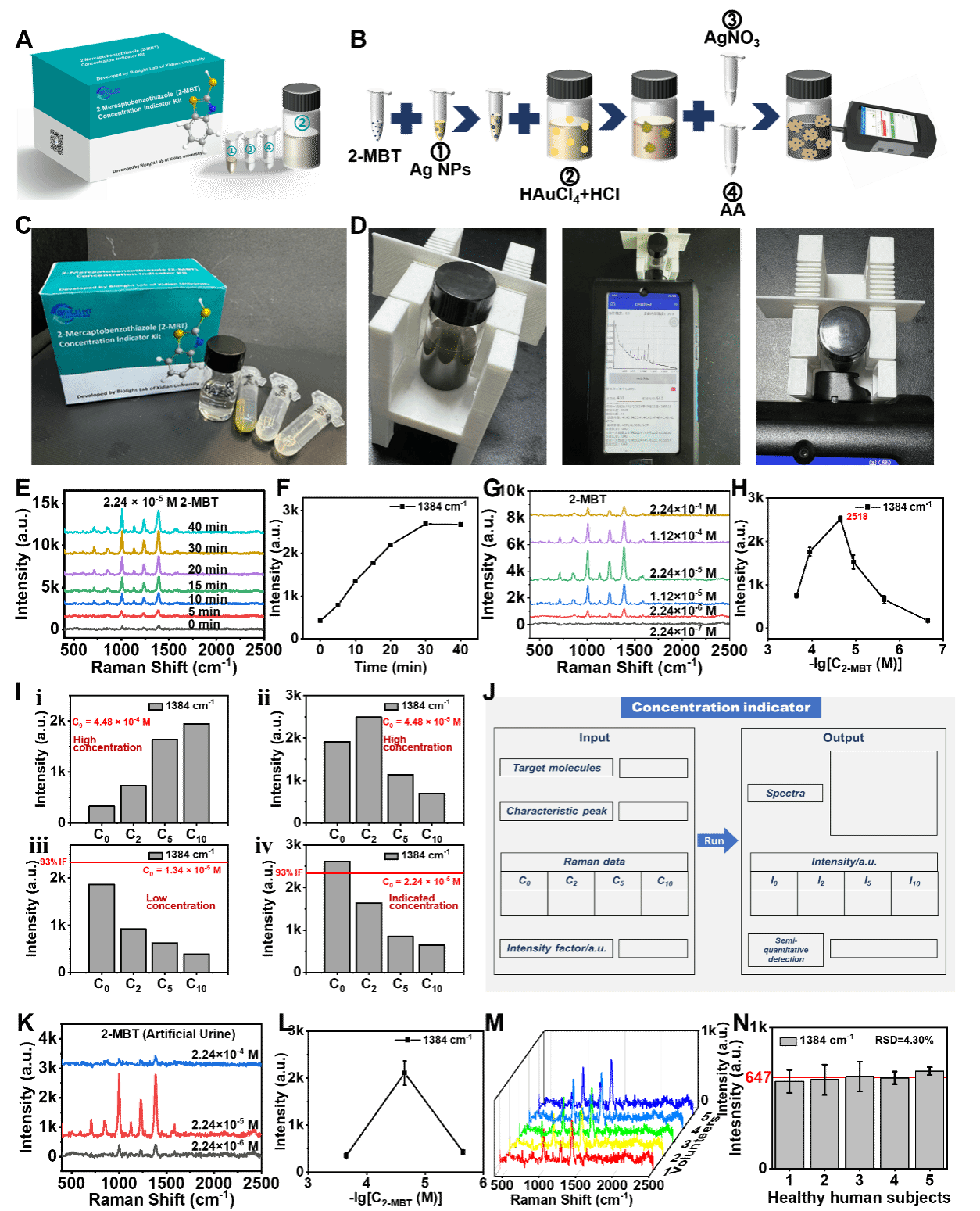 本研究基于蒲公英繁殖启发的SERS策略,开发了一种用户友好的浓度指示试剂盒,用于尿液中药物残留的快速半定量检测,以进行医学诊断。这种新颖的仿生SERS策略协同热点构建和分子吸附,显著增强了拉曼信号并提高了静态液相检测中的再现性。该策略通过优化热点构建和分子吸附的协同作用实现显著的信号增强,其分析增强因子达到2.503×10⁵,是银纳米颗粒的4143倍。提出了一种称为“浓度指示”的新概念,即在特定指示浓度下SERS信号显著增强,而在相邻浓度下则保持较弱。具有用户界面的浓度指示试剂盒在标准溶液和模拟尿液样品中半定量检测2-MBT方面表现出优异的性能,显示出在医学诊断中POCT的巨大潜力。未来的研究方向将着重于扩大到其他临床相关生物标志物的应用范围,调节指示浓度范围以满足各种诊断需求,并探索同时检测多种分析物的可能性。这些进展将进一步增强这种基于SERS的诊断平台在生物医学应用中的实际应用。