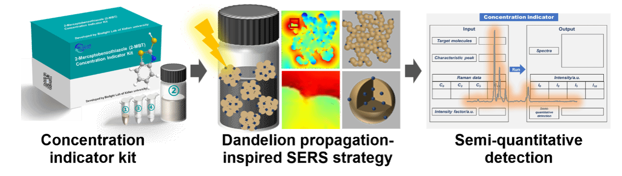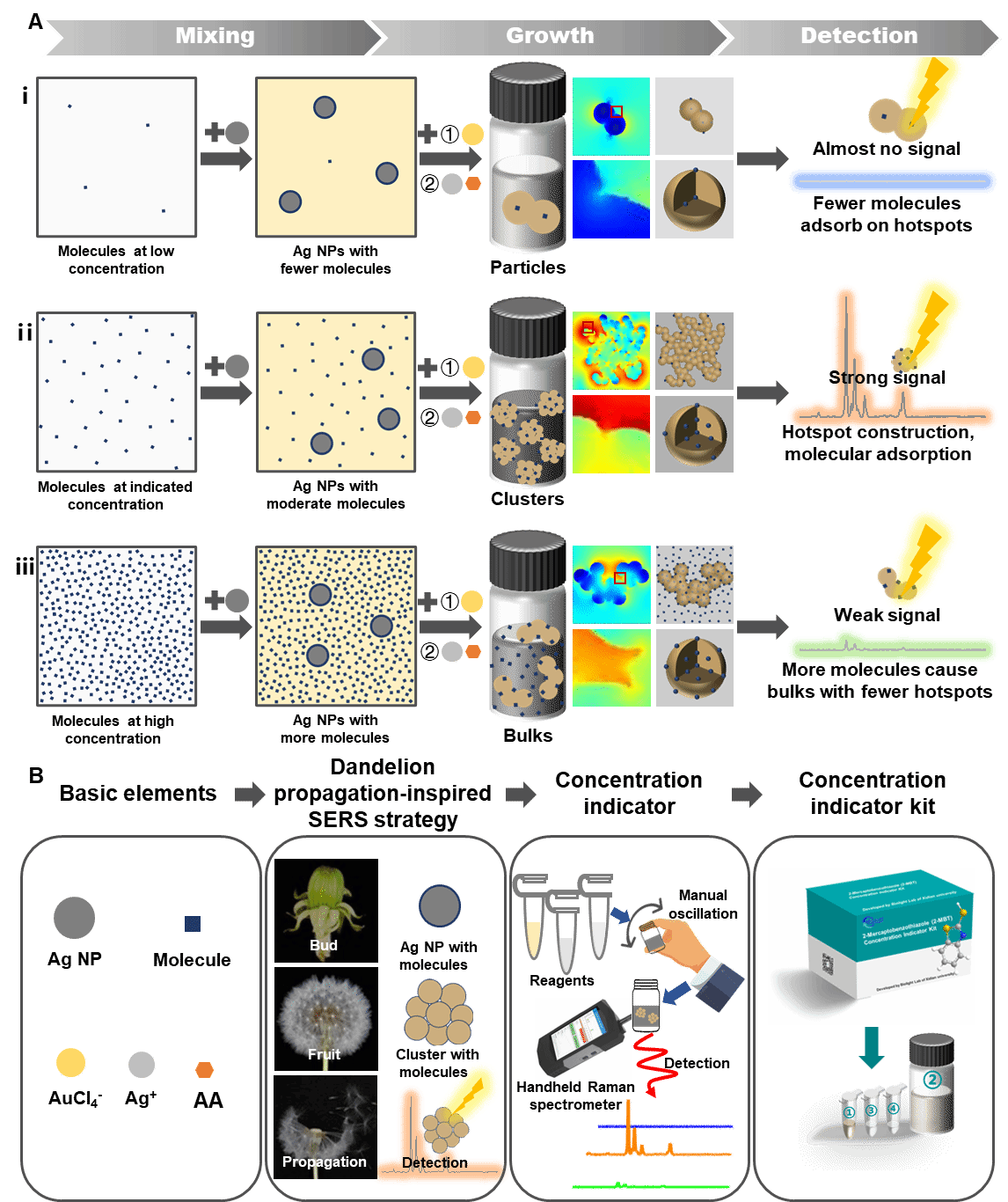 基于蒲公英传播启发SERS策略的浓度指示试剂盒示意图