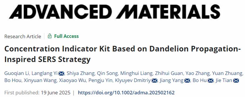 原文链接:Guoqian Li, Langlang Yi,* Shiya Zhang, Qin Song, Minghui Liang, Zhihui Guan, Yao Zhang, Yuan Zhuang, Bo Hou, Xinyuan Wang, Xiaoyao Wu, Pengju Yin, Klyuyev Dmitriy, * Jiang Yang, * Bo Hu, * Jie Tian* Concentration Indicator Kit Based on Dandelion Propagation-Inspired SERS Strategy, Advanced Materials, 2025, DOI:10.1002/adma.202502162. https://advanced.onlinelibrary.wiley.com/doi/10.1002/adma.202502162