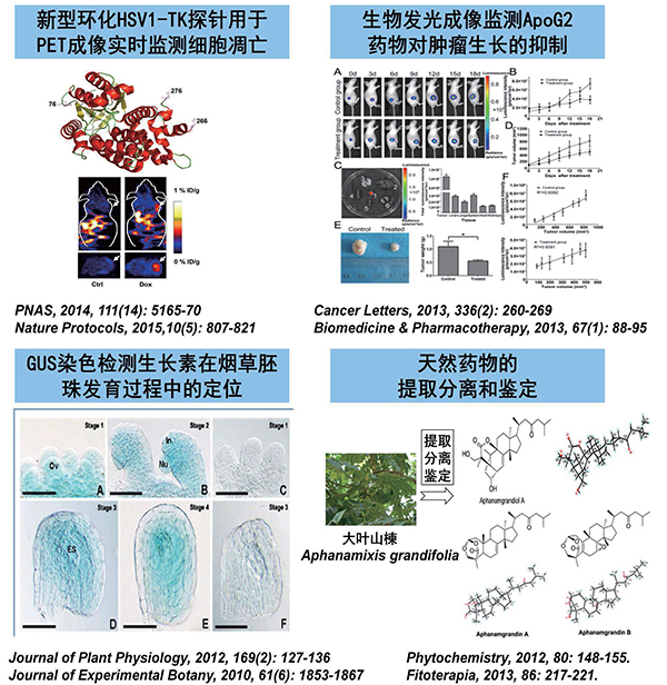 生物医学应用研究室致力于多模态分子影像技术在生物医学领域的应用研究,主要研究方向包括肿瘤生物探针成像及应用研究、智能化纳米药物载体及肿瘤诊治研究、天然药物活性及机理研究以及植物发育及抗性研究。本研究室目前拥有副教授3人,讲师2人,承担国家自然基金项目4项,陕西省基金1项,中央高校基本科研业务费5项,近年来在PNAS、Nature Protocols、Cancer Letters等国际主流杂志发表论文20余篇。